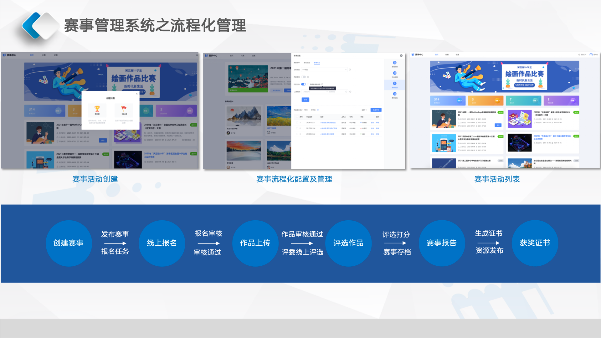 提供从赛事创建、报名、作品提交、专家在线评审、证书发放、数据统计到成果展示的完整流程管理能力,支持配置不同类型的赛事模板和流程节点。
