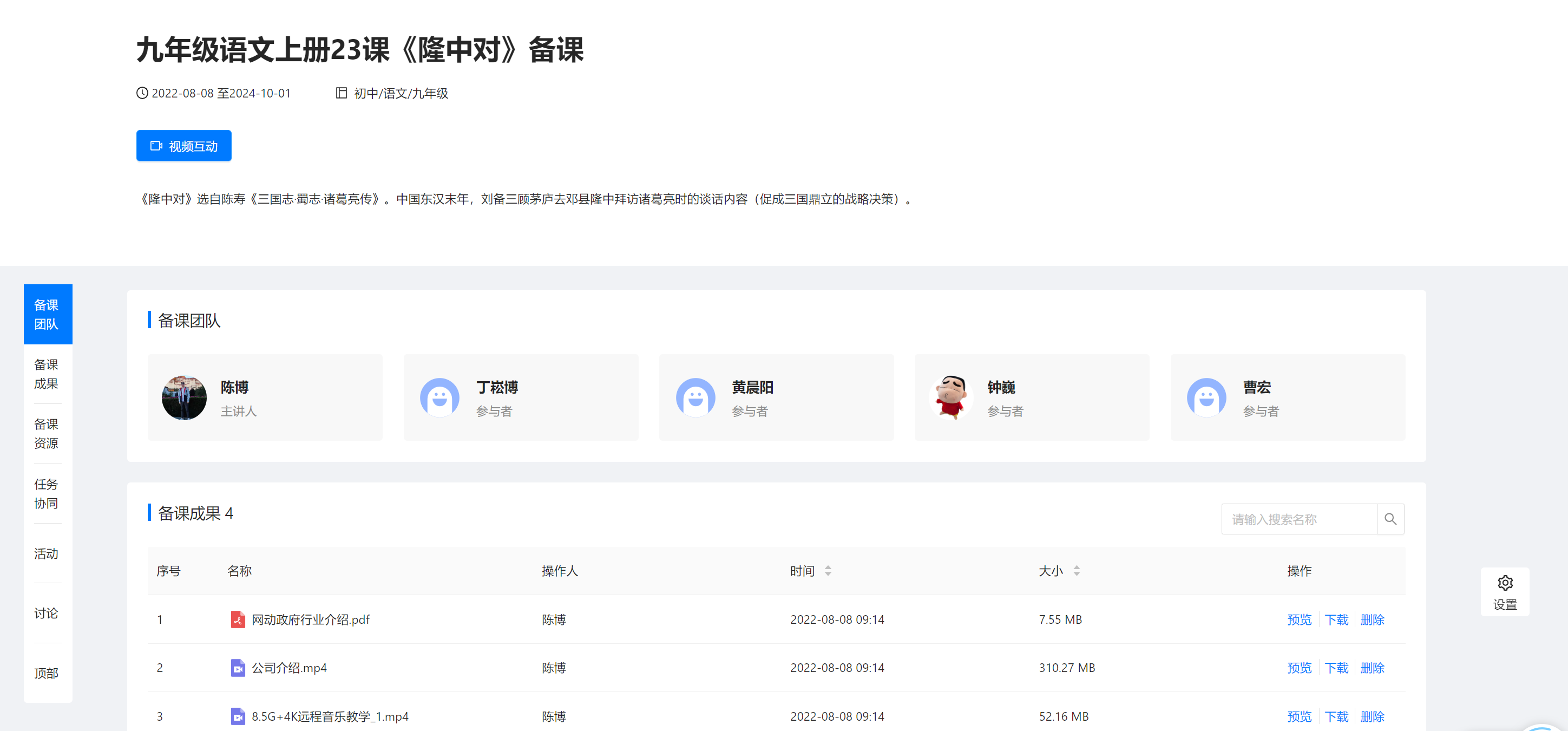 备课主题发起、教学设计分工、教案协同编写、备课成果展示到评议总结的全流程数字化支持,确保备课过程规范化、可追溯。