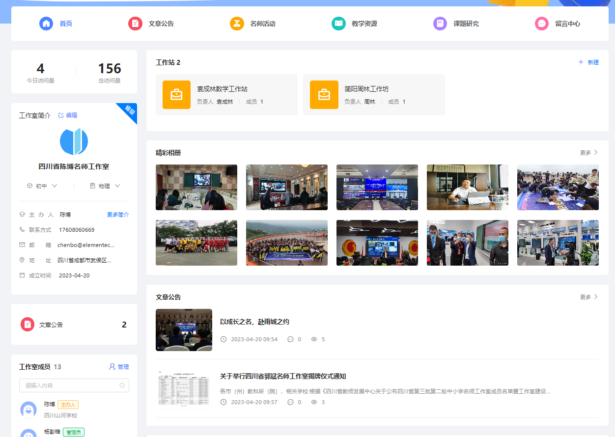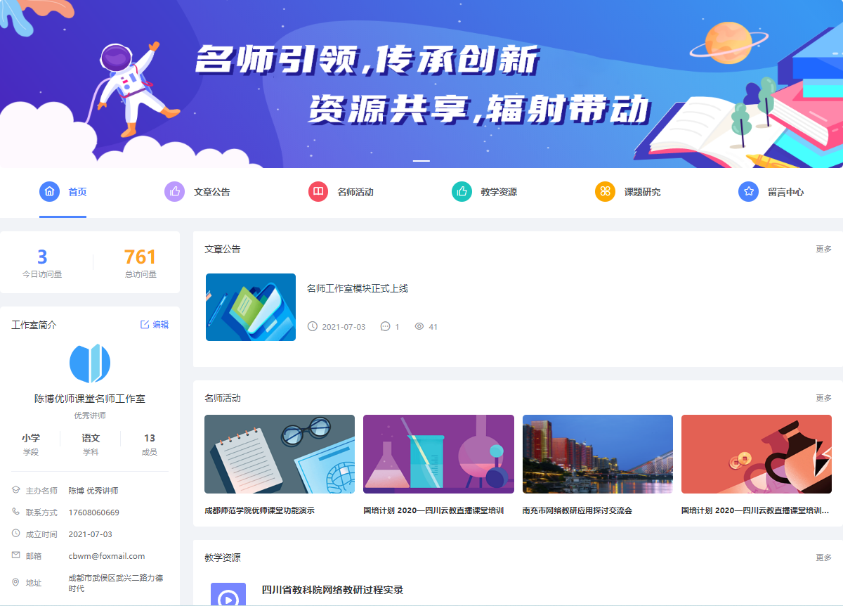 支持名师工作室在线发起培训课程、专题研讨、公开课展示等活动,并能利用系统工具进行精品课件、教学案例等优质资源的协同创作和积累。