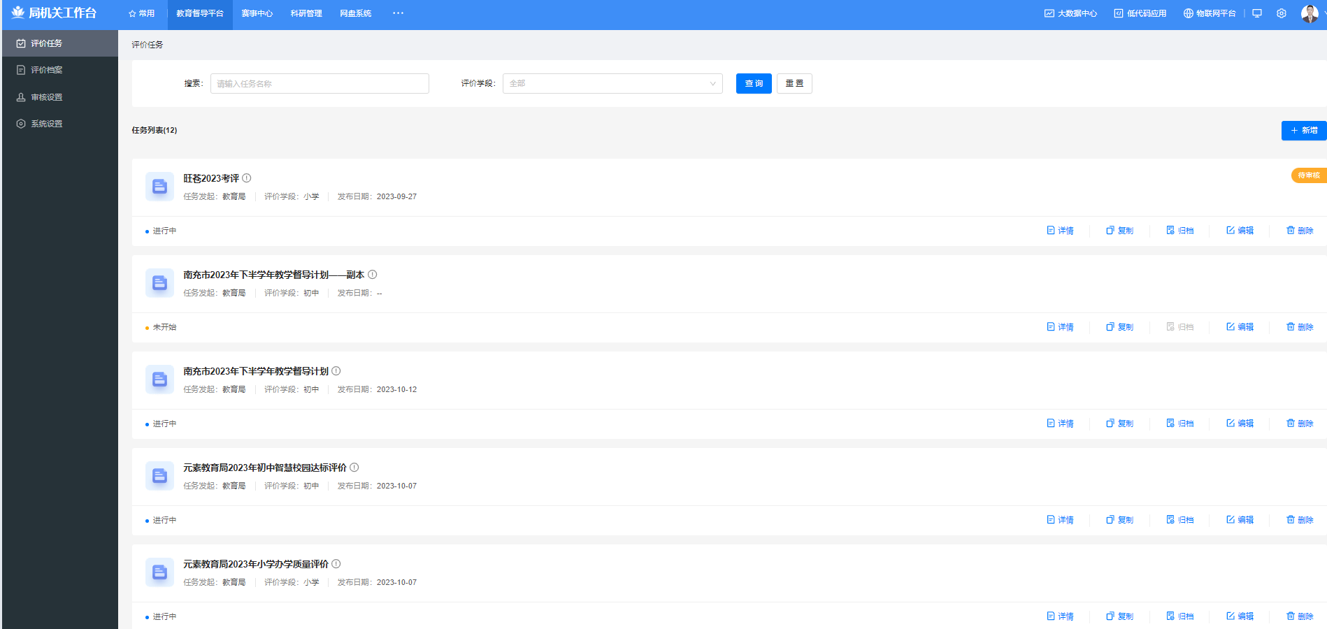 支持创建包括专项督导、综合督导、日常巡查等多种类型的督导任务,支持自定义督导指标体系、检查表单、时间节点和督导人员分配,实现督导工作的规范化。