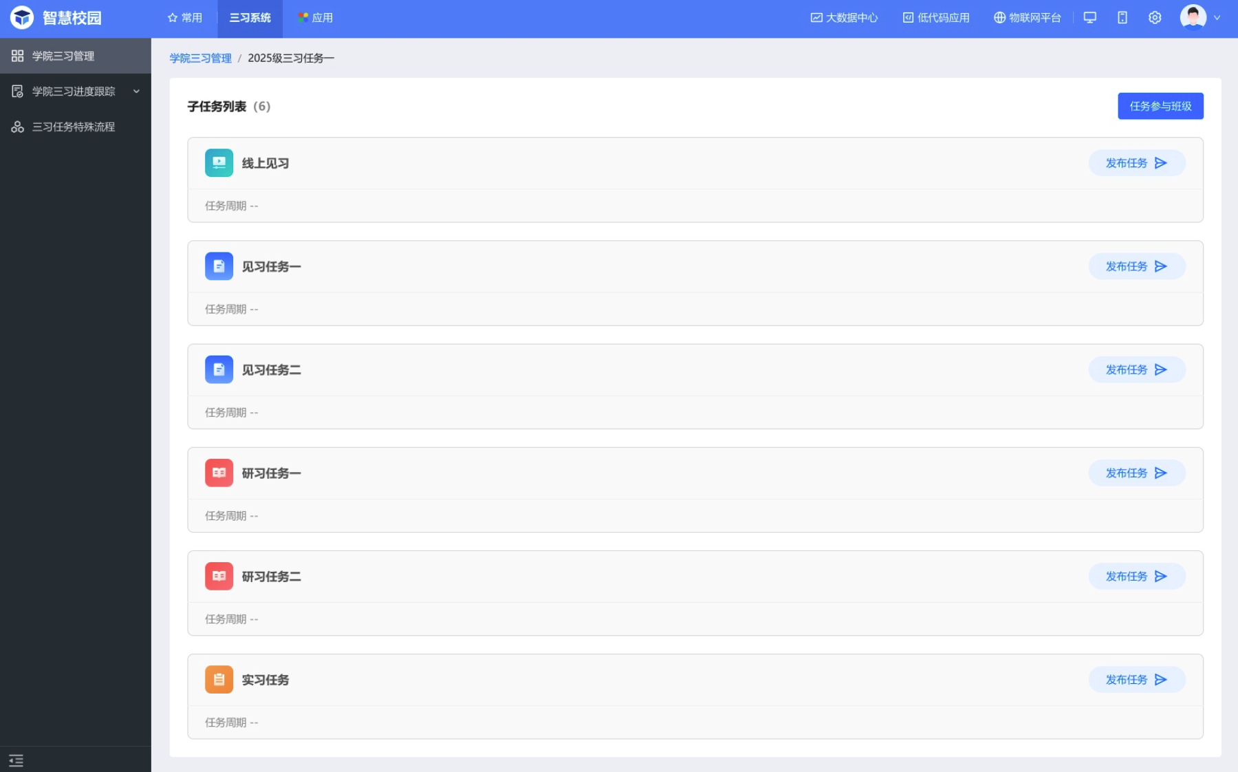 实训资源精细调度:联动校内实训基地与校外实习学校,实现指导老师分配与任务要求的一键发布。