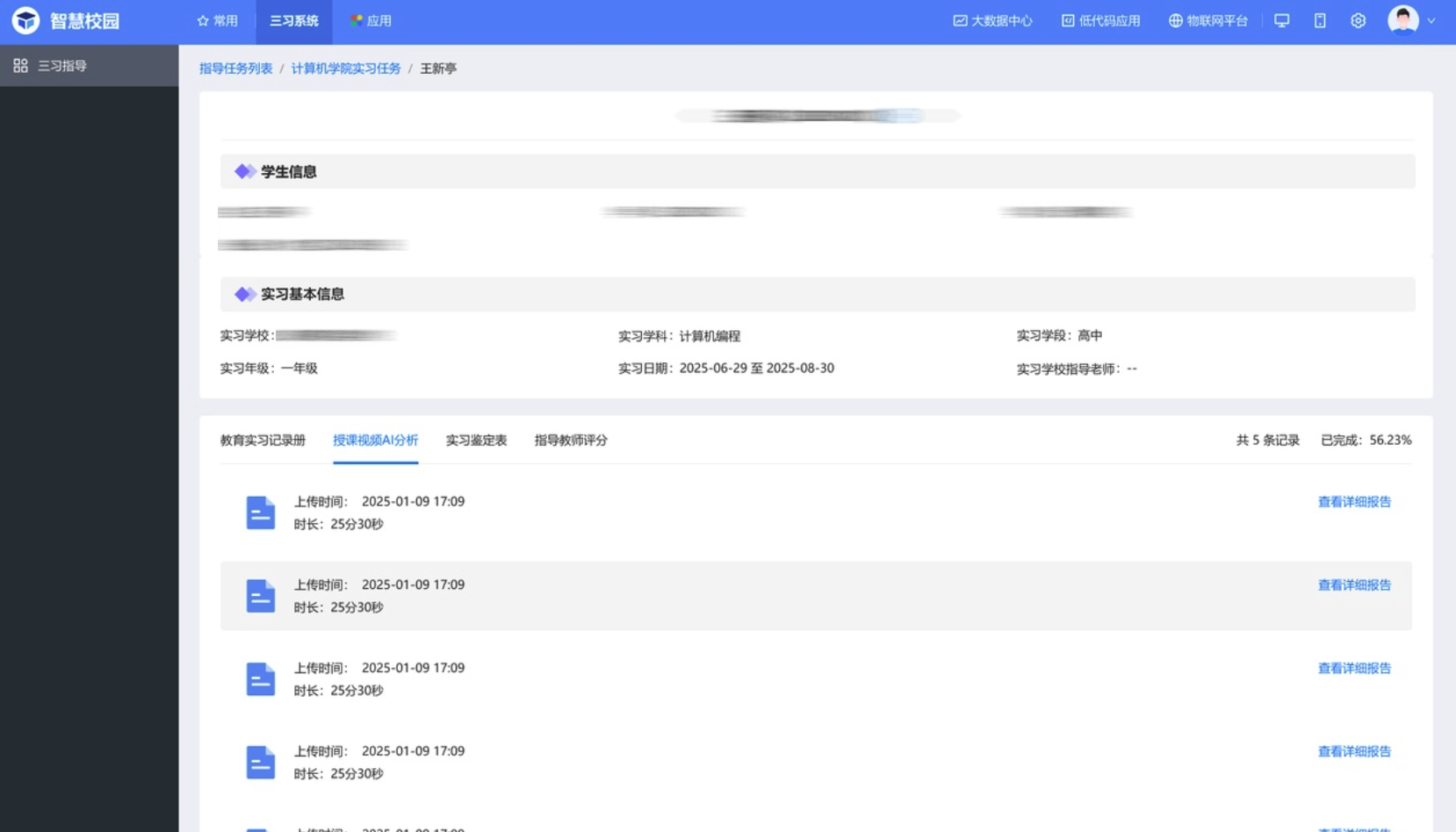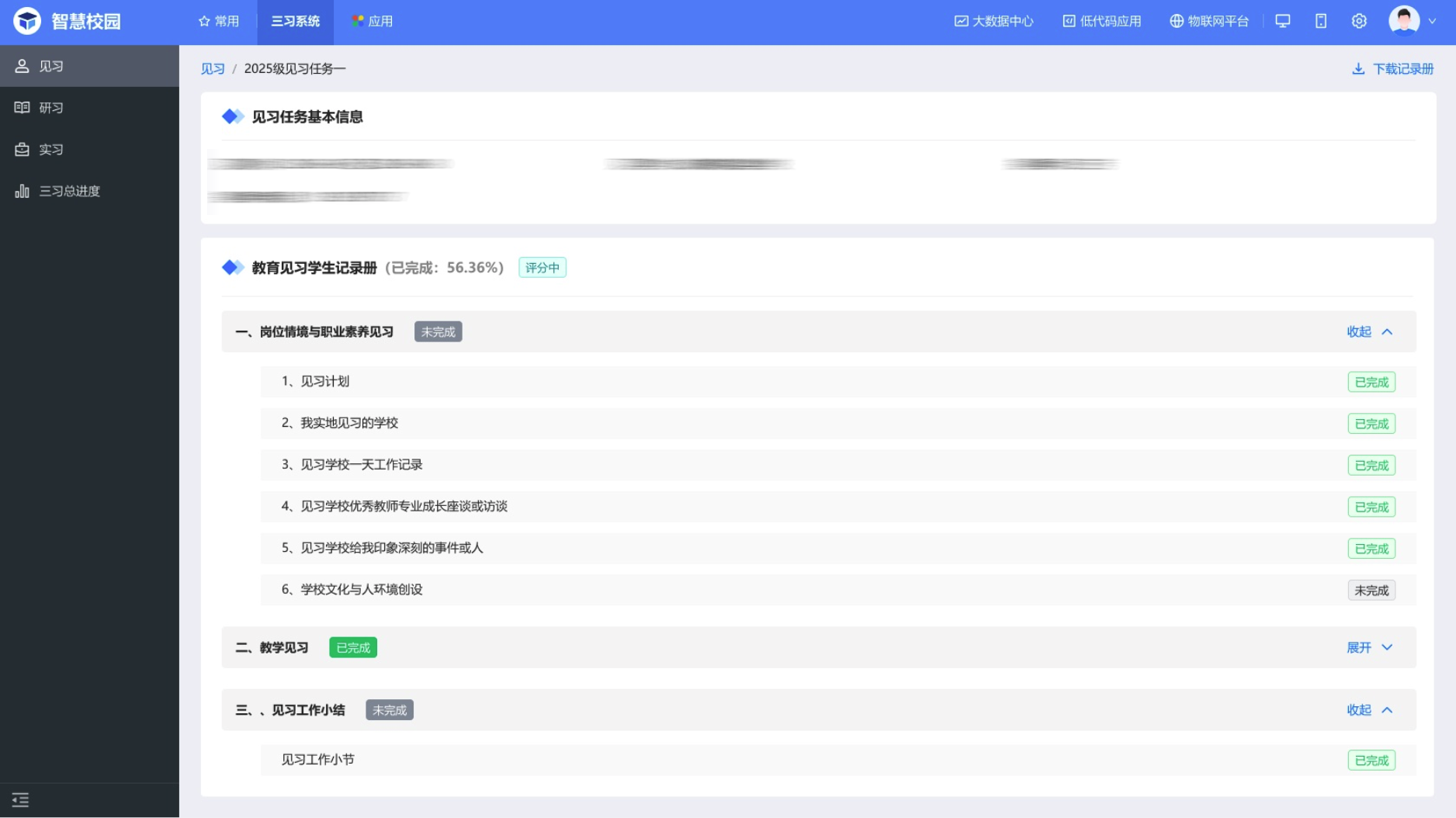 实习报告与记录册提交:学生在线填报分章节的见习/研习记录册,支持上传授课视频等实训成果。