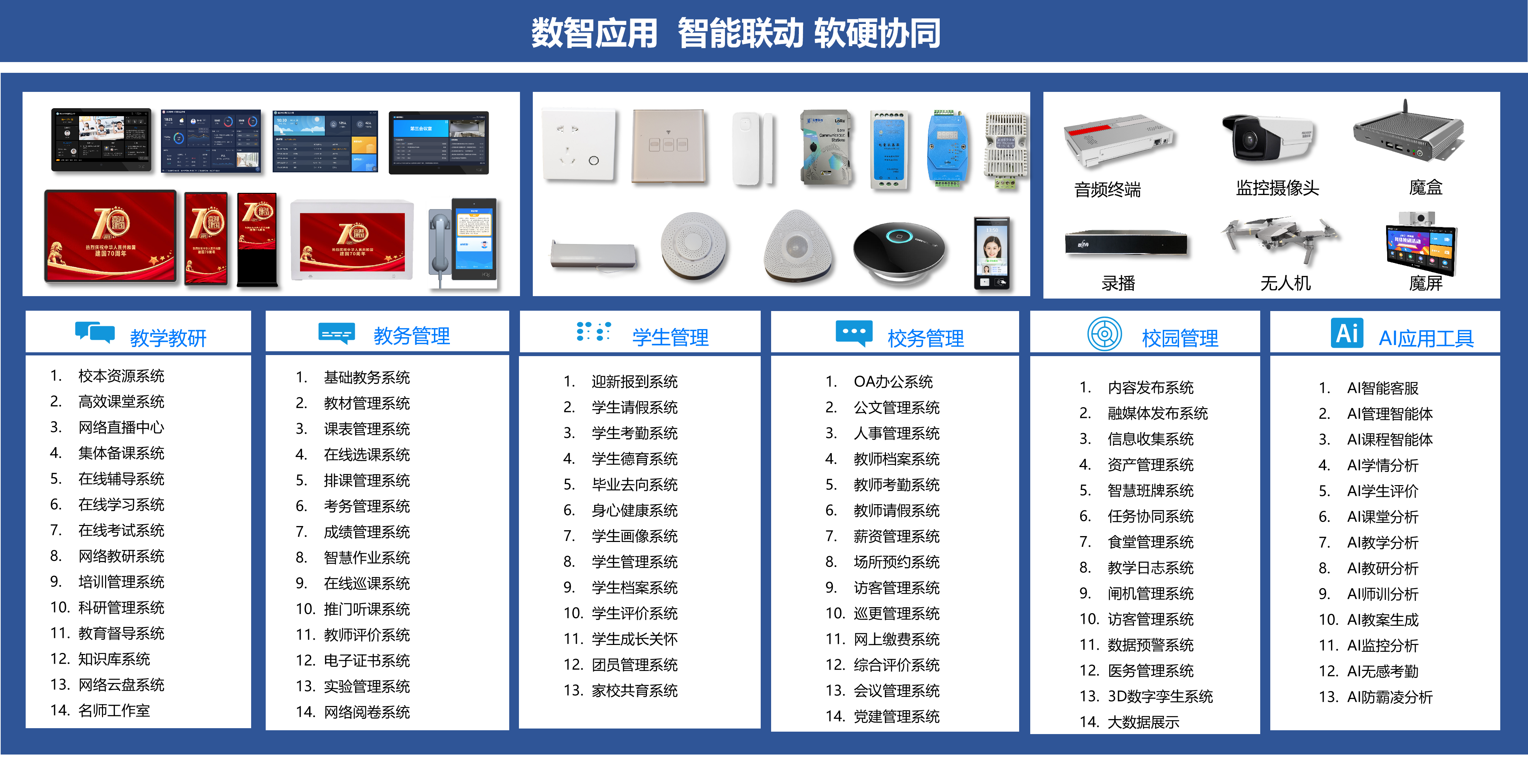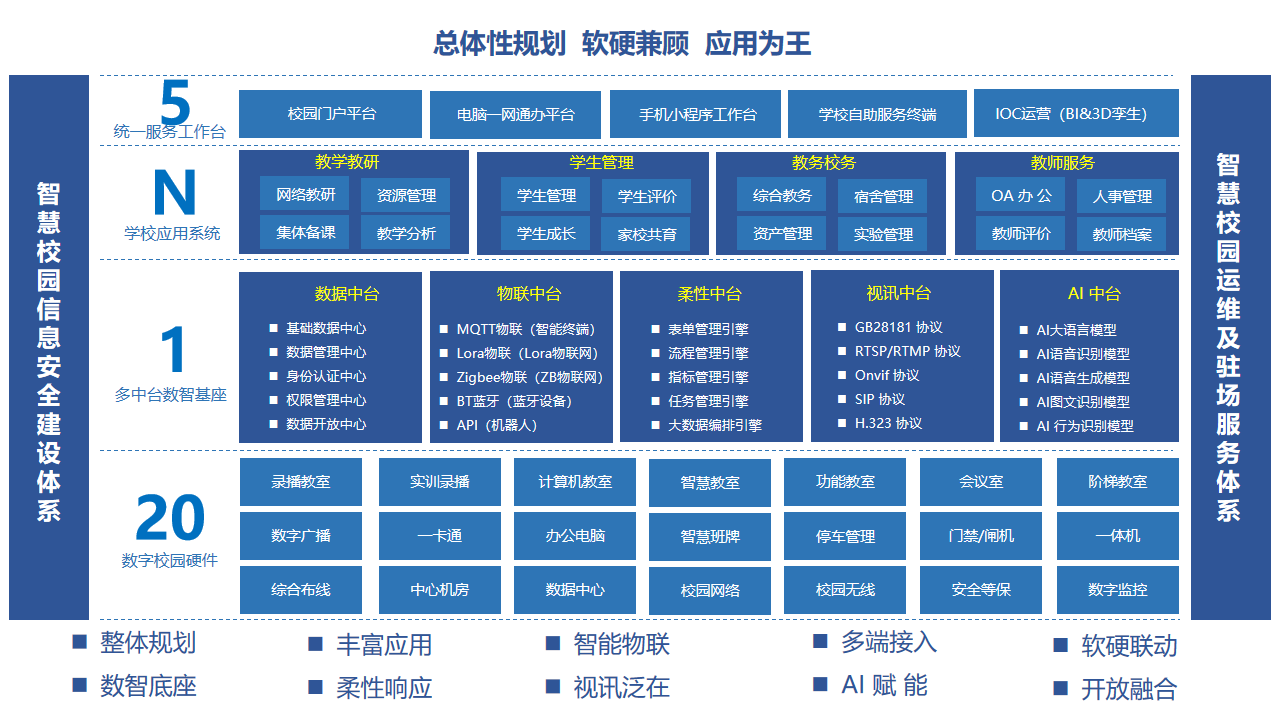 智慧校园通过AI、大数据、物联网与教育教学的深度融合,构建一个互联互通、软硬协同、智能高效的一体化环境; 提升育人质量、优化管理效能、保障校园安全,并赋能个性化学习与科学决策,最终实现教育的数字化转型与高质量发展。
