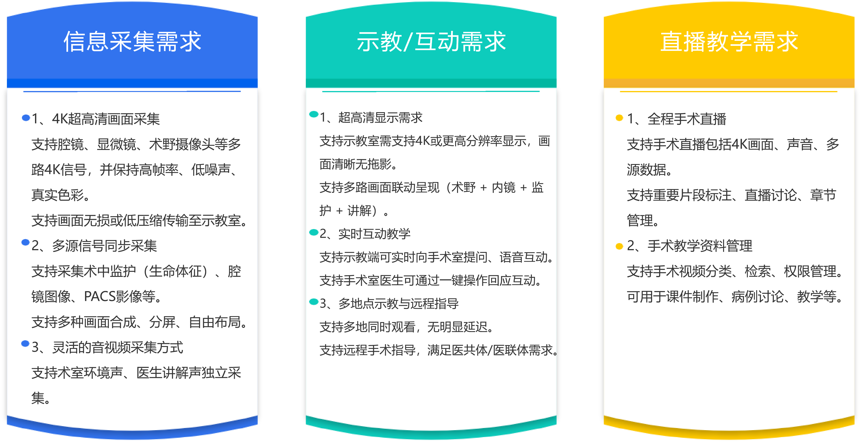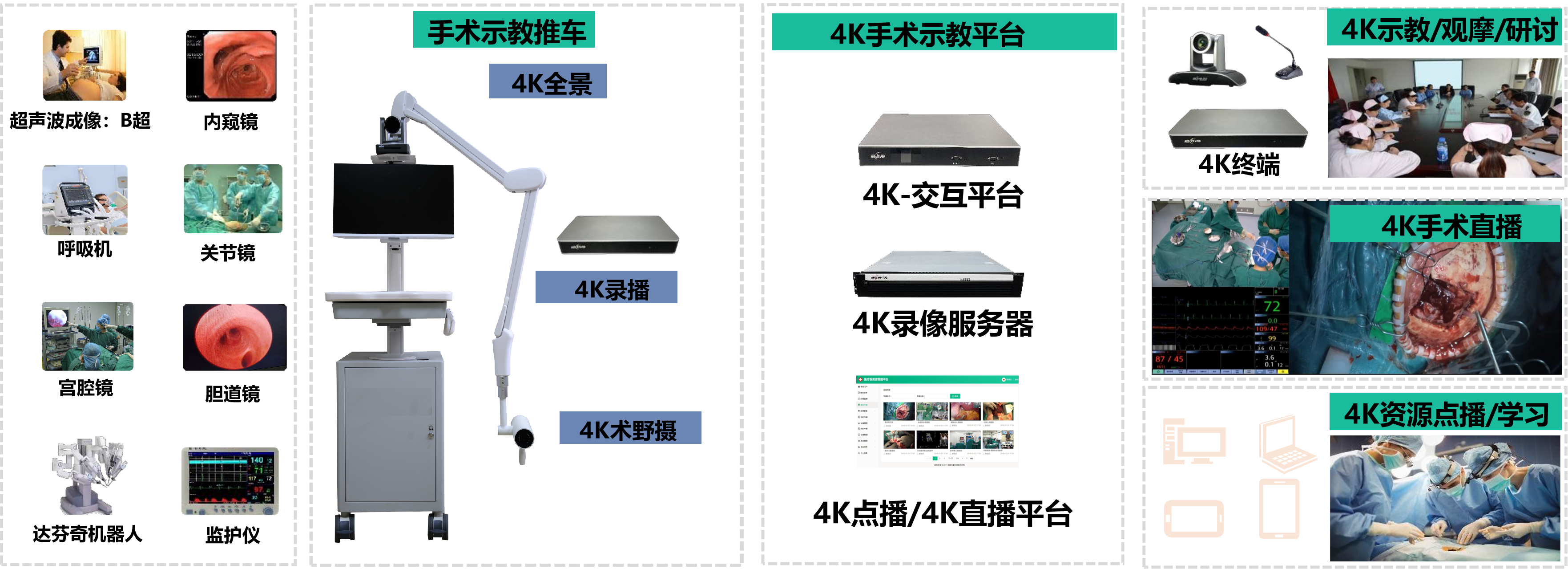 4K手术示教系统是基于超高清(3840×2160)图像采集与传输技术的手术教学与远程指导平台, 可将手术视野、术中影像、声音与手术室环境信息同步输出,实现院内外实时教学、远程示教和术式学习。 它主要由 4K摄像系统、音视频处理器、网络传输模块、显示终端、录播存储系统 等部分构成, 可实现超高清手术画面采集、编码、直播、录制、回放等功能。