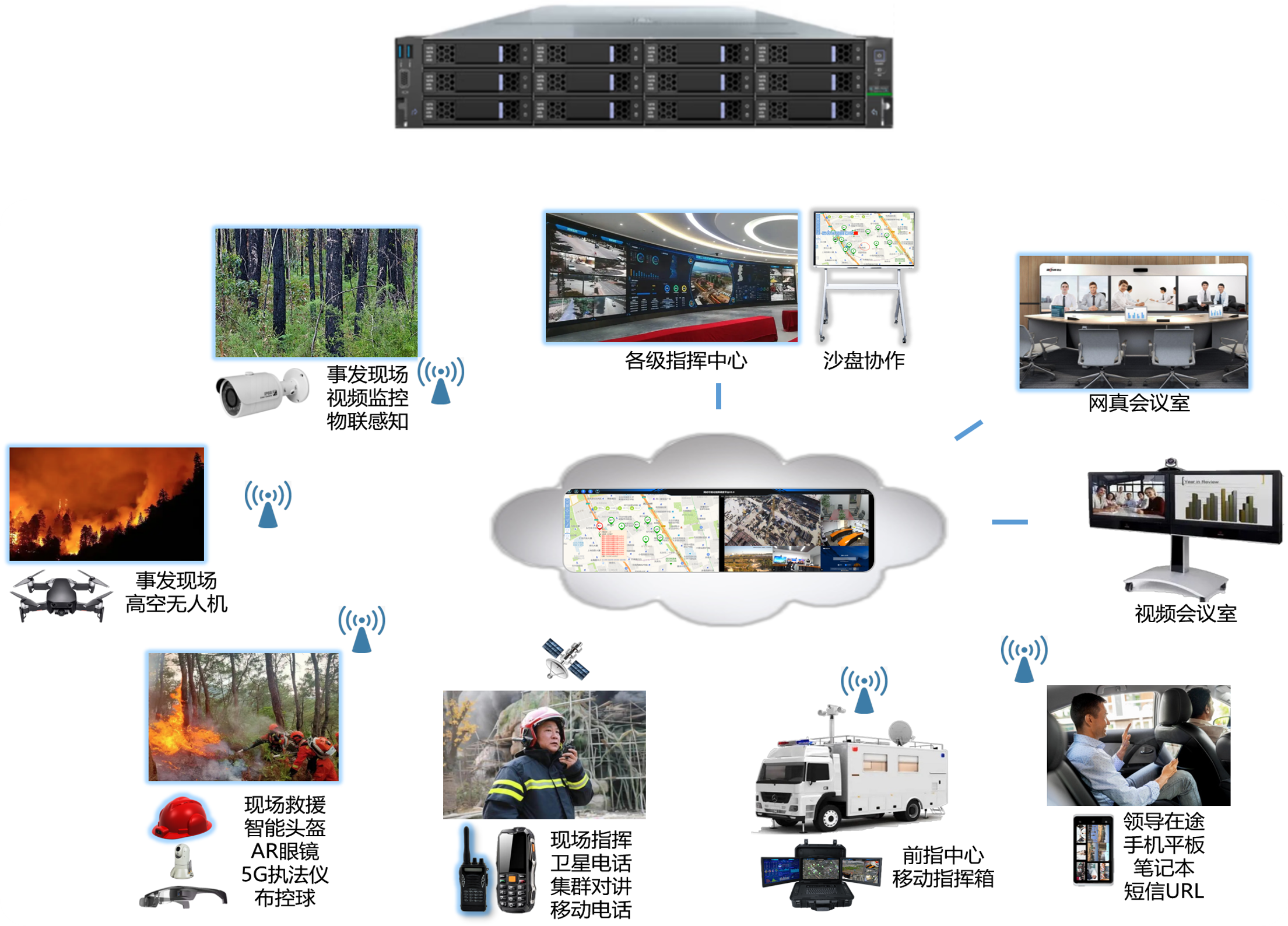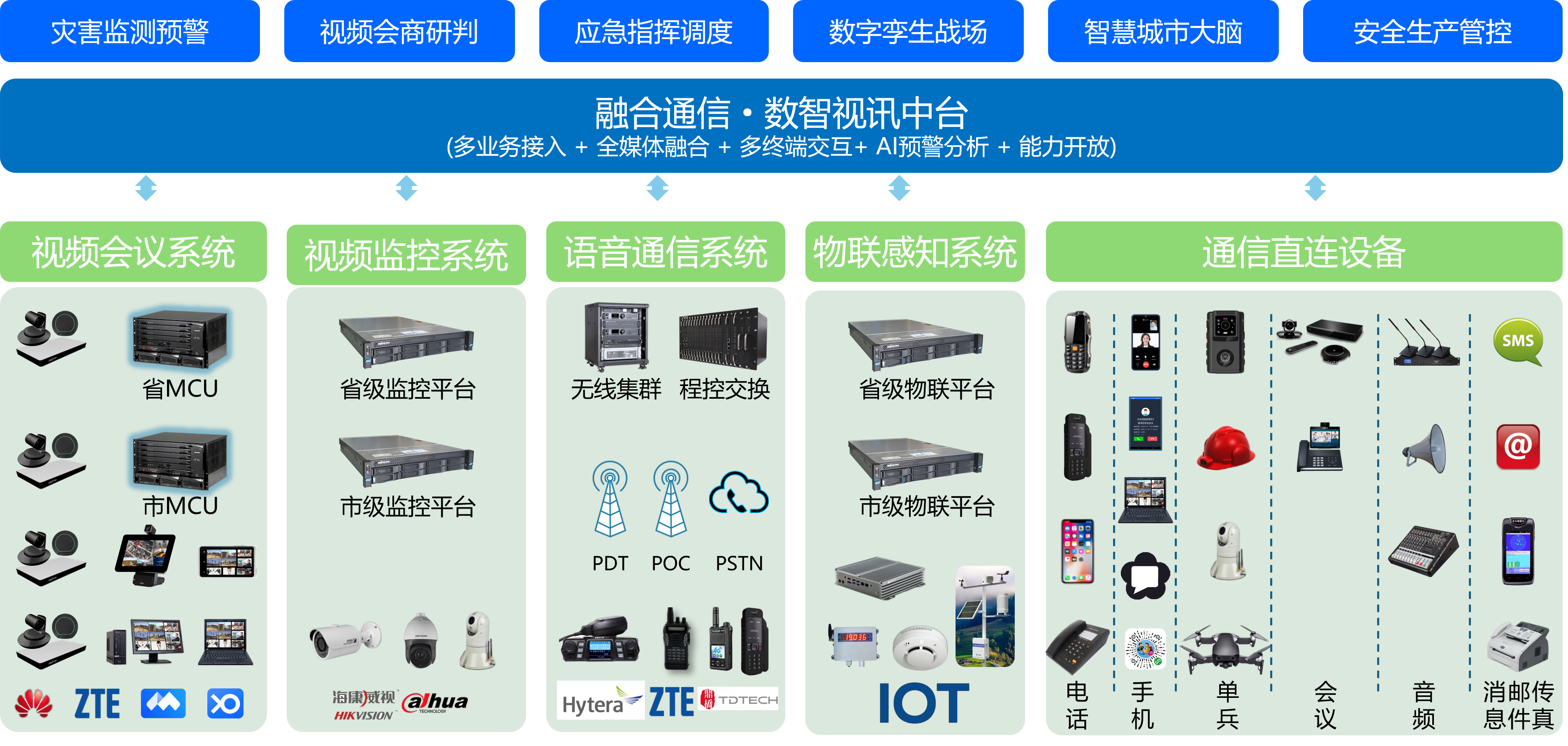 会议融合、视频融合、语音融合、物联感知融合、全场景通信融合、AI预警分析等,可统一调度各类硬件设备、统一开放API接口,为第三方业务平台提供全方位的能力支撑