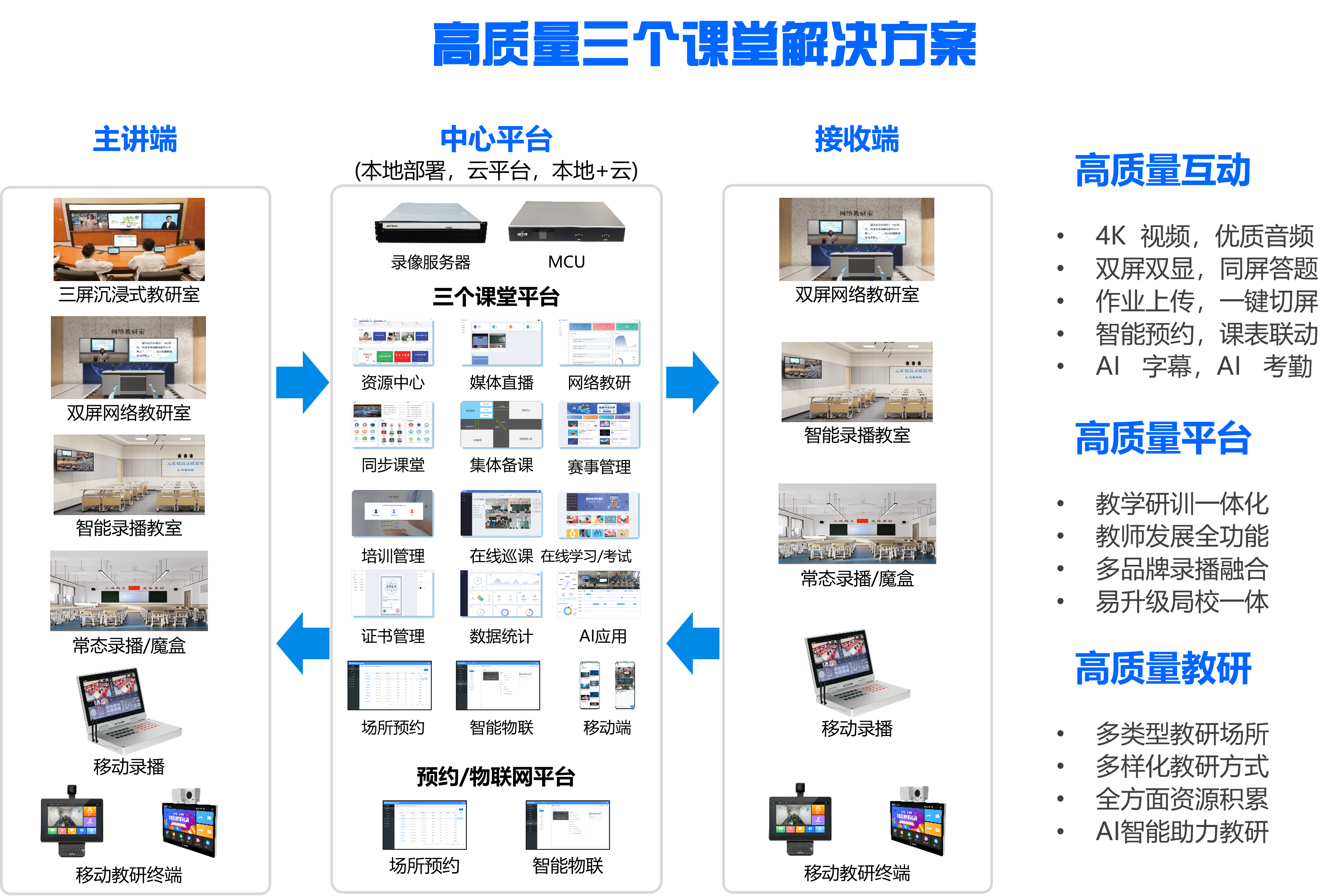 4K互动教学、课中一键切屏、作业上传评讲 多录播融合接入、教学研评管一体化 全功能教研、AI课堂分析