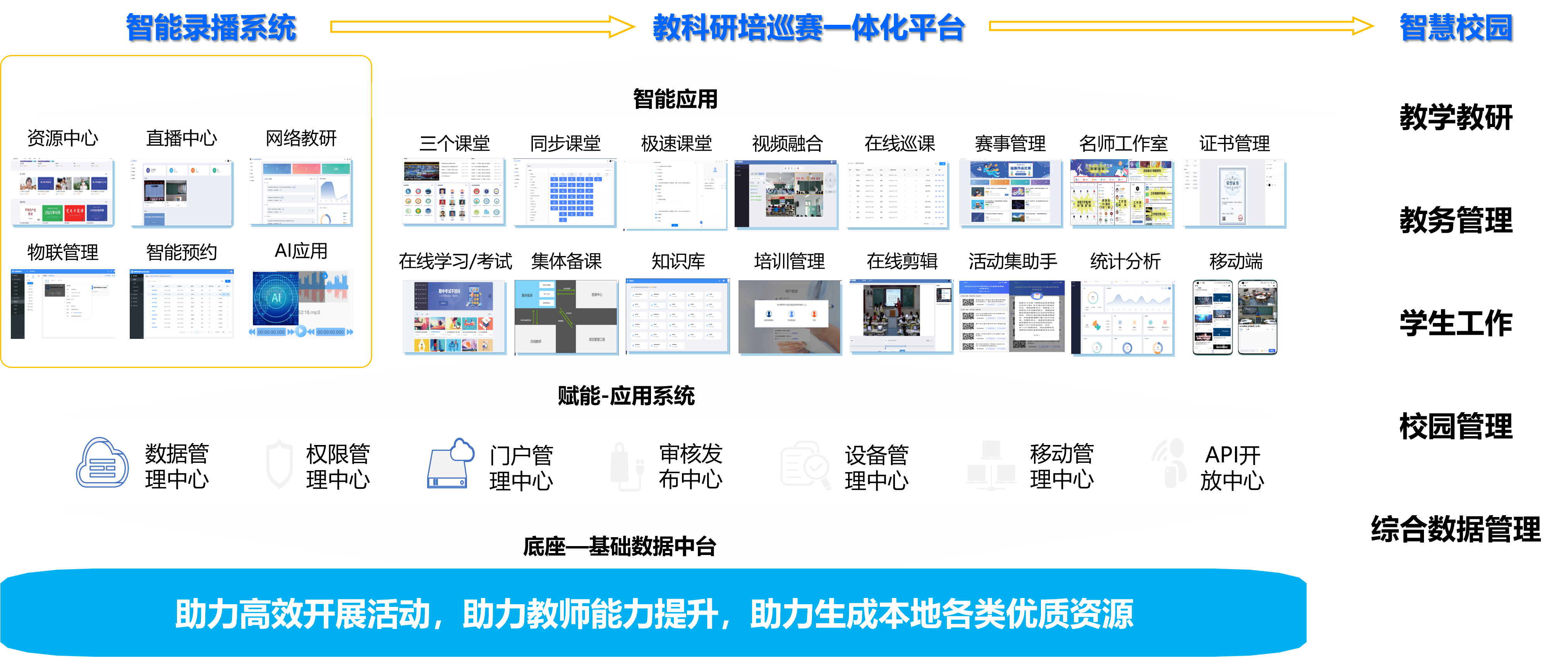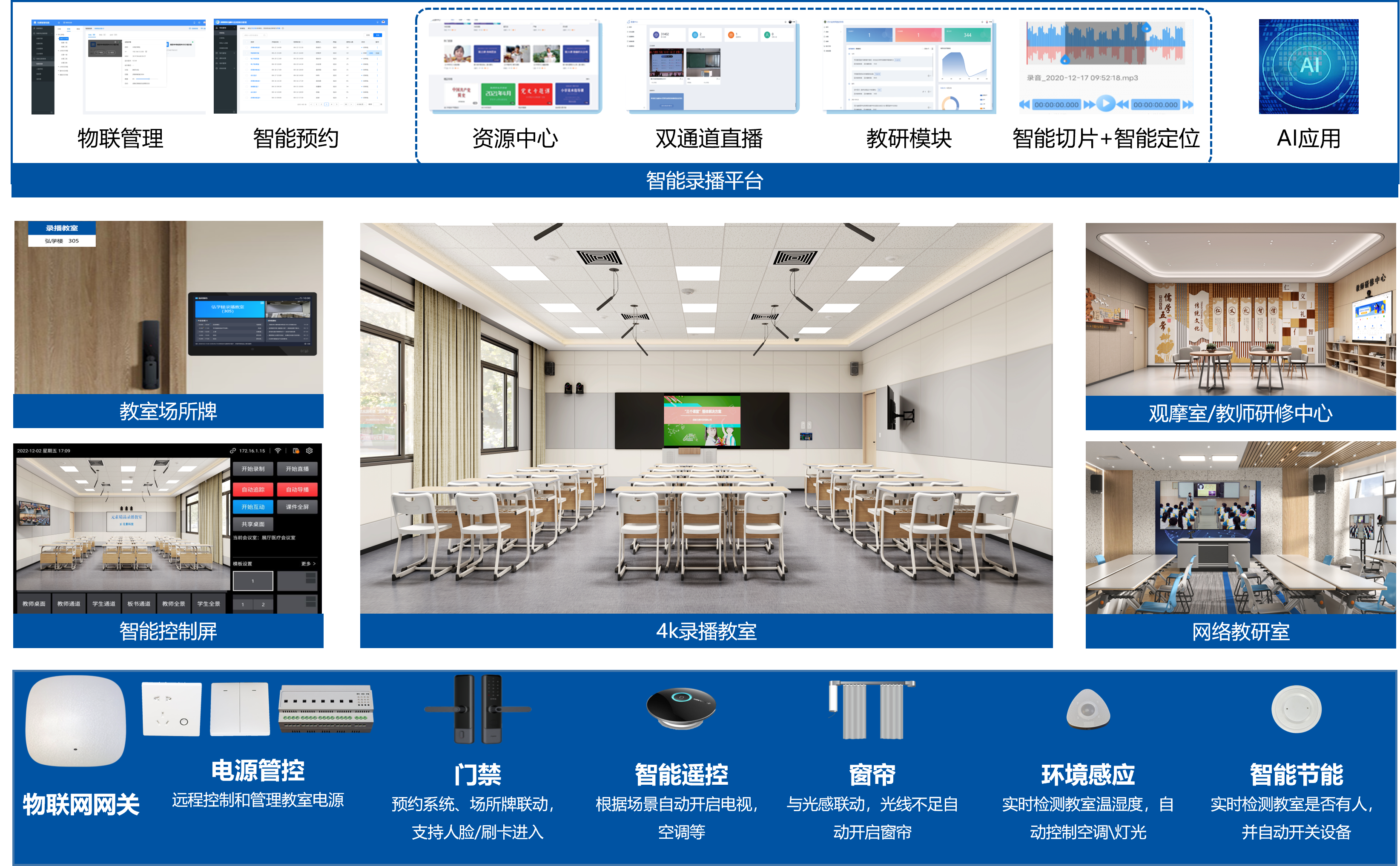 智能录播解决方案,集4K超高清录播、智能物联管理、课表 智能联动、多模态教研、AI课堂教学分析等多功能于一体